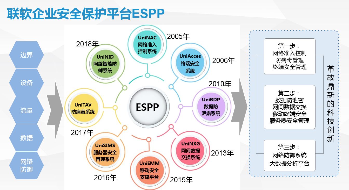 目前,聯(lián)軟科技形成了基于TDNA(可信數(shù)字網絡架構)統(tǒng)一管控理念下的ESPP企業(yè)安全保護平臺,產品和解決方案涵蓋了網絡設備、桌面終端、服務器設備、內部數(shù)據(jù)的安全管控,解決了企業(yè)級用戶網絡接入控制、PC/BYOD/服務器設備安全管控、數(shù)據(jù)防泄密、數(shù)據(jù)安全交換與審計、防病毒管理等問題。通過創(chuàng)新性企業(yè)移動安全支撐平臺,矢量水印等專利技術,為企業(yè)業(yè)務全流程構建完整的網絡安全防護網絡,做到“將安全隱藏在業(yè)務背后,安全與業(yè)務融為一體”。