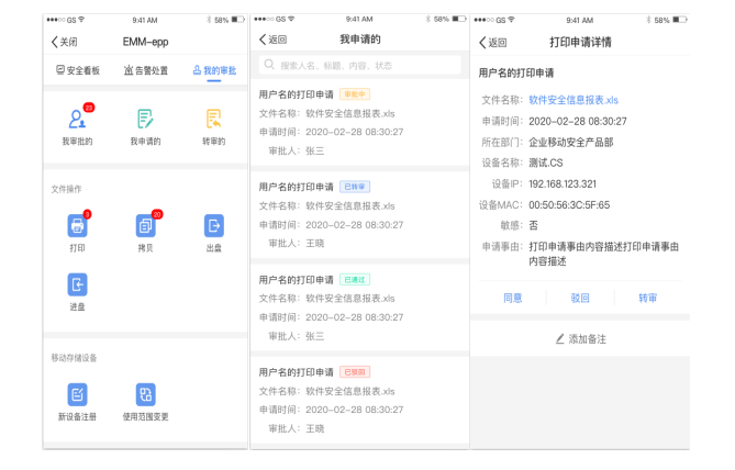 針對(duì)PC端審批流程的相關(guān)痛點(diǎn),聯(lián)軟提供了企業(yè)移動(dòng)辦公安全支撐平臺(tái)UniEMM,創(chuàng)新性的將UniDLP上的審批操作開發(fā)成一個(gè)獨(dú)立的審批應(yīng)用,提供移動(dòng)審批功能,既保證了相關(guān)的審批流程安全性,又解放了審批人,只需要通過(guò)個(gè)人手機(jī)無(wú)需回到內(nèi)網(wǎng)使用辦公PC即可完成相關(guān)審批操作。大大提升了審批人的操作體驗(yàn),從而提高了審批流程的時(shí)效性。