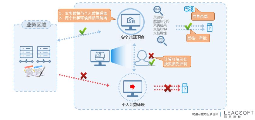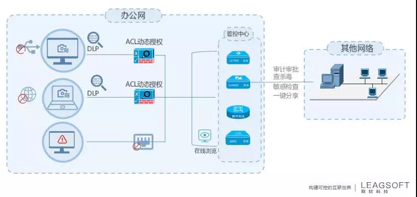 【方案要點(diǎn)】通過網(wǎng)絡(luò)準(zhǔn)入控制的動態(tài)授權(quán)限定私人設(shè)備只能訪問互聯(lián)網(wǎng),并提供數(shù)據(jù)安全擺渡系統(tǒng),作為外部數(shù)據(jù)導(dǎo)入入口,保障在網(wǎng)絡(luò)隔離的前提下將外部數(shù)據(jù)安全的導(dǎo)入到內(nèi)部終端。