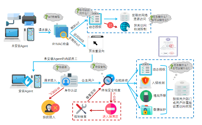邊界的接入認(rèn)證和訪(fǎng)問(wèn)控制是涉密網(wǎng)安全控制的基礎(chǔ),也是分級(jí)保護(hù)技術(shù)標(biāo)準(zhǔn)中明確要求的必備設(shè)施之一,如果不構(gòu)建涉密網(wǎng)的邊界接入控制設(shè)施,在檢查過(guò)程中如果發(fā)現(xiàn),會(huì)被一票否決。因此,強(qiáng)烈建議用戶(hù)為涉密網(wǎng)部署網(wǎng)絡(luò)準(zhǔn)入控制系統(tǒng),通過(guò)該系統(tǒng)提供的訪(fǎng)問(wèn)控制策略,可實(shí)現(xiàn)基于用戶(hù)的強(qiáng)制訪(fǎng)問(wèn)控制,防止未授權(quán)、非合規(guī)的設(shè)備接入涉密網(wǎng),并對(duì)其資源訪(fǎng)問(wèn)權(quán)限進(jìn)行控制,實(shí)現(xiàn)最小授權(quán),防止越權(quán)訪(fǎng)問(wèn)非權(quán)限范圍內(nèi)的涉密信息系統(tǒng)資源。