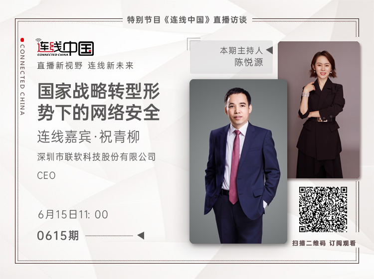6月15日上午11:00,聯(lián)軟科技CEO祝青柳做客首檔大型金融媒體企業(yè)家訪談節(jié)目《連線中國(guó)》,作為國(guó)內(nèi)一檔大型金融媒體直播訪談欄目,《連線中國(guó)》以“開(kāi)創(chuàng)新視野、連線新希望”為口號(hào),通過(guò)對(duì)話杰出企業(yè)家,講述中國(guó)企業(yè)的故事,為中國(guó)品牌發(fā)聲,傳遞中國(guó)經(jīng)濟(jì)破浪前行的決心與信心!面對(duì)國(guó)家戰(zhàn)略轉(zhuǎn)型形勢(shì)下的網(wǎng)絡(luò)安全,聽(tīng)聯(lián)軟如何發(fā)聲: