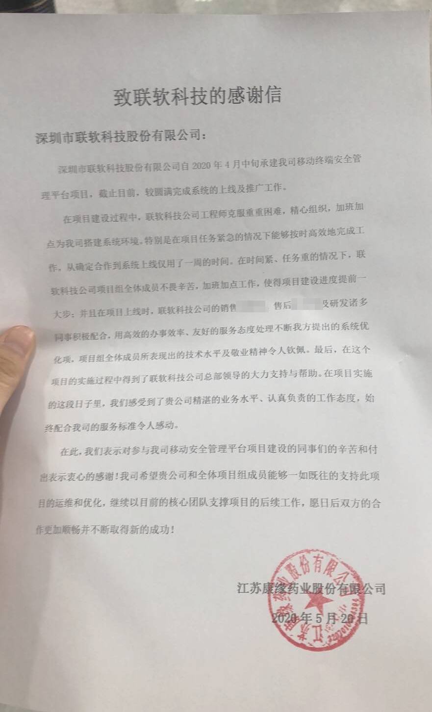 很榮幸收到康緣藥業(yè)寄來的感謝信,聯(lián)軟也期待加強與康緣藥業(yè)的合作,為康緣藥業(yè)后續(xù)的服務獻策獻力,以實現(xiàn)雙方共贏。