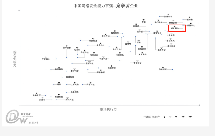 6月29日,國內網絡安全行業(yè)第三方權威調研機構“數(shù)世咨詢”發(fā)布《中國網絡安全能力100強》,聯(lián)軟科技憑借在網絡安全領域的深厚積累和核心優(yōu)勢,成功入選百強競爭者企業(yè)點陣,并處于領先地位!