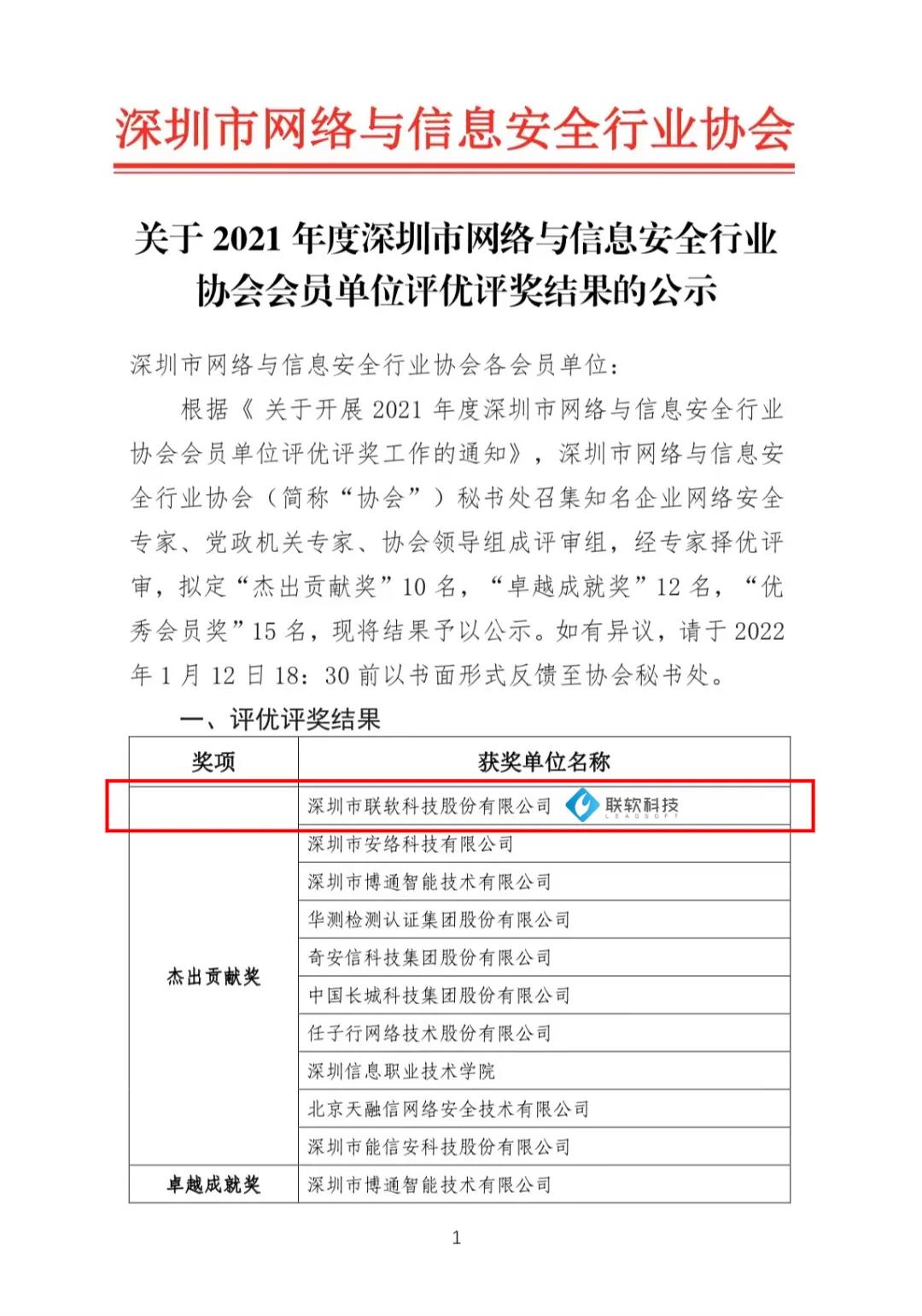 近日,深圳市網(wǎng)絡(luò)與信息安全行業(yè)協(xié)會(huì)(以下簡(jiǎn)稱協(xié)會(huì))為激勵(lì)會(huì)員單位爭(zhēng)創(chuàng)一流,更好地推動(dòng)網(wǎng)絡(luò)安全行業(yè)的發(fā)展,開(kāi)展了協(xié)會(huì)會(huì)員單位2021年度評(píng)優(yōu)評(píng)獎(jiǎng)工作。經(jīng)過(guò)專家擇優(yōu)評(píng)審后,聯(lián)軟科技獲“杰出貢獻(xiàn)