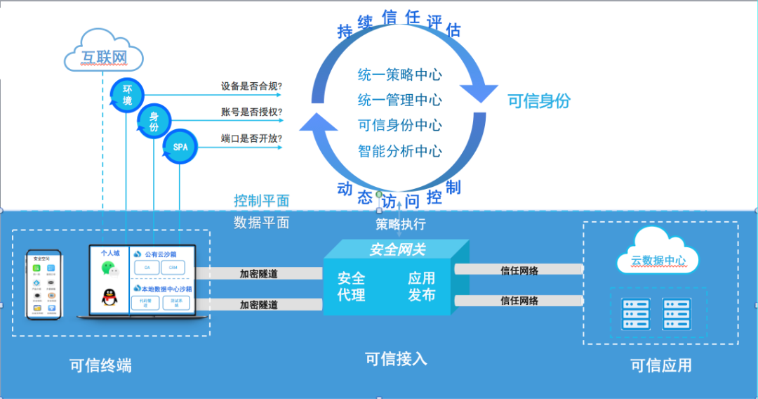 ●基于零信任理念實(shí)現(xiàn)持續(xù)信任評估,動(dòng)態(tài)訪問控制;
