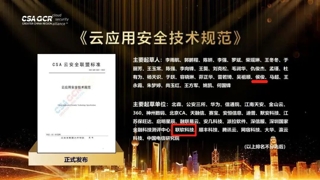 近日,第六屆云安全聯(lián)盟大中華區(qū)大會(CSA GCR Congress)的“CSA成果發(fā)布&云頒獎典禮”在線成功召開。聯(lián)軟科技參與《云應(yīng)用安全技術(shù)規(guī)范》的編寫工作,該項(xiàng)規(guī)范獲本次CSA大會優(yōu)秀項(xiàng)目獎。