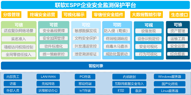 基于醫(yī)院現(xiàn)有終端信息化能力,以聯(lián)軟主機監(jiān)控與審計系統(tǒng)為基礎(chǔ)的《醫(yī)院內(nèi)網(wǎng)終端安全一體化解決方案》,通過一套系統(tǒng),實現(xiàn)醫(yī)院內(nèi)外網(wǎng)桌面終端的資產(chǎn)管理、安全管理、桌面管理、安全運維、外設(shè)管理、網(wǎng)絡(luò)接入控制,在保障終端安全的基礎(chǔ)上統(tǒng)一化管理及運維,減少運維工作。