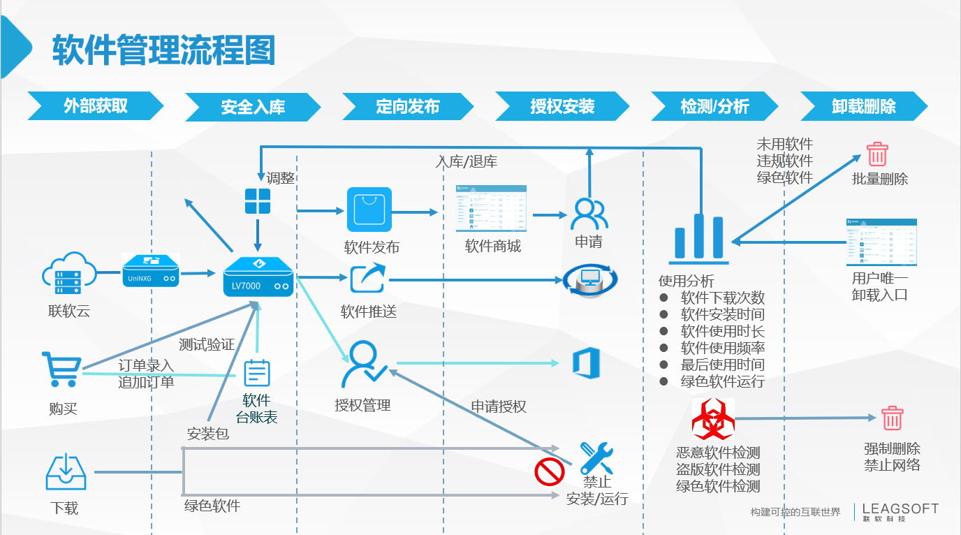 聯(lián)軟科技提供的軟件管理解決方案,不但滿足《正版軟件管理工作指南》中關(guān)于醫(yī)院軟件正版化管理的要求,也能幫助醫(yī)院規(guī)范軟件標(biāo)準(zhǔn)化管理。該方案包括以下內(nèi)容: