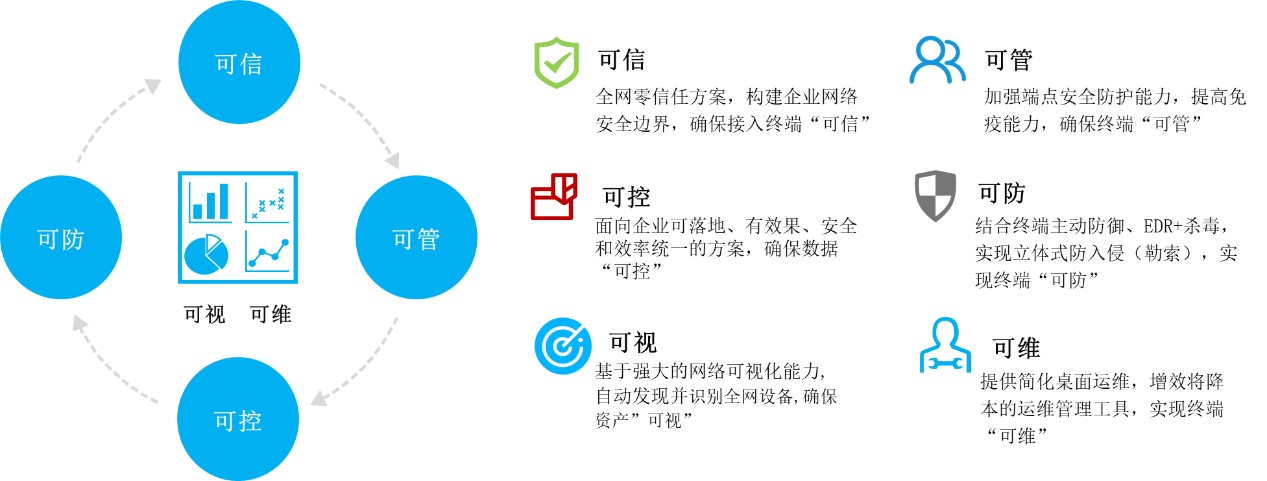 終端桌面管控:涵蓋終端安全基線完善與加固、終端標(biāo)準(zhǔn)化管理、運(yùn)維簡(jiǎn)化管理、軟件正版化和標(biāo)準(zhǔn)化管理;