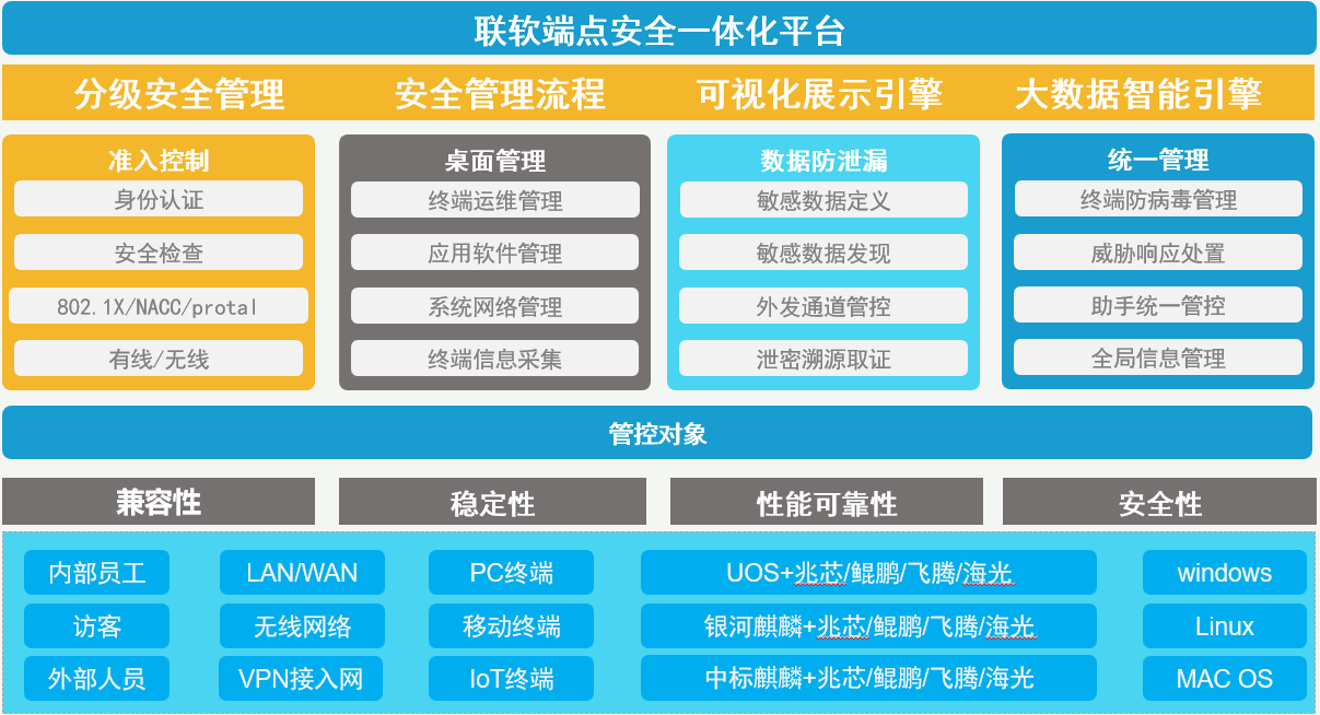本方案以聯(lián)軟ESPP企業(yè)安全保護平臺為基礎,幫助企業(yè)建立一個實現(xiàn)企業(yè)內(nèi)部終端安全保護、運維管理及數(shù)據(jù)保護的一體化管控平臺,解決企業(yè)計算機入網(wǎng)合規(guī)性和安全管理等問題,提供包含網(wǎng)絡準入、桌面管理、數(shù)據(jù)防泄密、文檔安全、終端檢測與響應、防病毒等功能。同時聯(lián)軟科技已經(jīng)完成與UOS、麒麟等信創(chuàng)操作系統(tǒng),龍芯、兆芯、飛騰、鯤鵬、X86等各類國產(chǎn)芯片,國產(chǎn)化數(shù)據(jù)庫與中間件進行適配。方案可實現(xiàn):