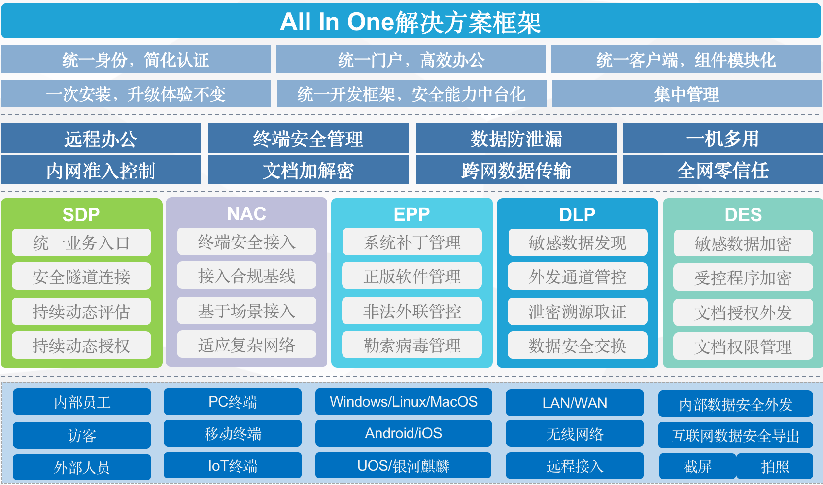 一個Agent從遠程接入管理、內(nèi)網(wǎng)準入控制、桌面運維管理、終端安全管理,到補丁加固、外設管控、終端行為審計、數(shù)據(jù)防泄密、文檔安全、防病毒等全場景進行統(tǒng)一安全保護。