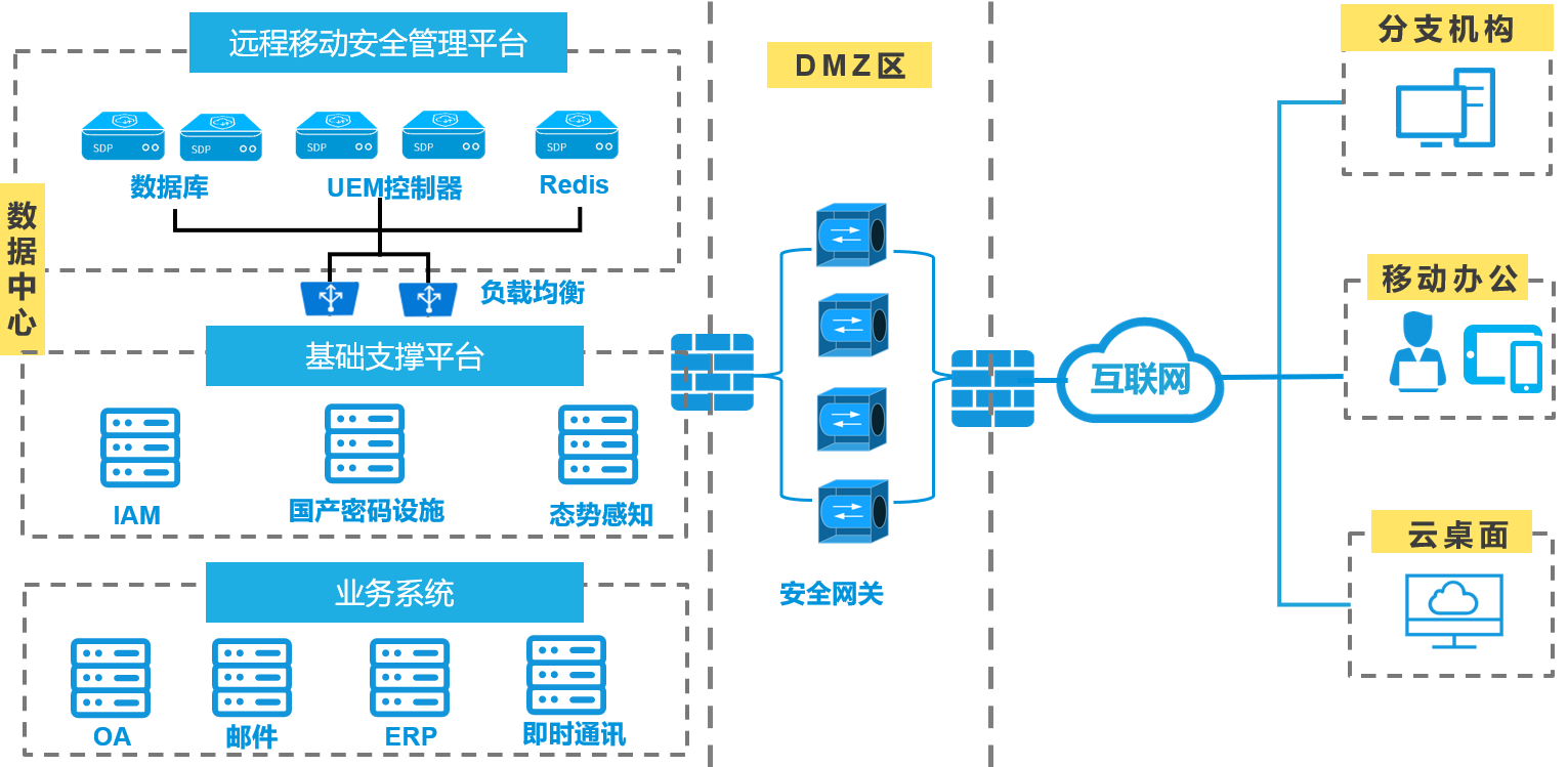 本方案以聯(lián)軟UniSDP零信任訪問控制系統(tǒng)與UniEMM企業(yè)移動(dòng)安全管理平臺(tái)協(xié)同應(yīng)用作為遠(yuǎn)程移動(dòng)辦公安全管理系統(tǒng),境內(nèi)數(shù)據(jù)中心內(nèi)部署管理平臺(tái)與安全網(wǎng)關(guān),作為遠(yuǎn)程訪問設(shè)備的統(tǒng)一管理平臺(tái),提供遠(yuǎn)程設(shè)備、業(yè)務(wù)應(yīng)用與數(shù)據(jù)安全防護(hù)相關(guān)功能。通過覆蓋PC與移動(dòng)端的零信任安全防護(hù)體系,構(gòu)建遠(yuǎn)程辦公場(chǎng)景下使用數(shù)據(jù)過程中的設(shè)備、身份、數(shù)據(jù)、通信管理能力,整體平臺(tái)部署具體如下: