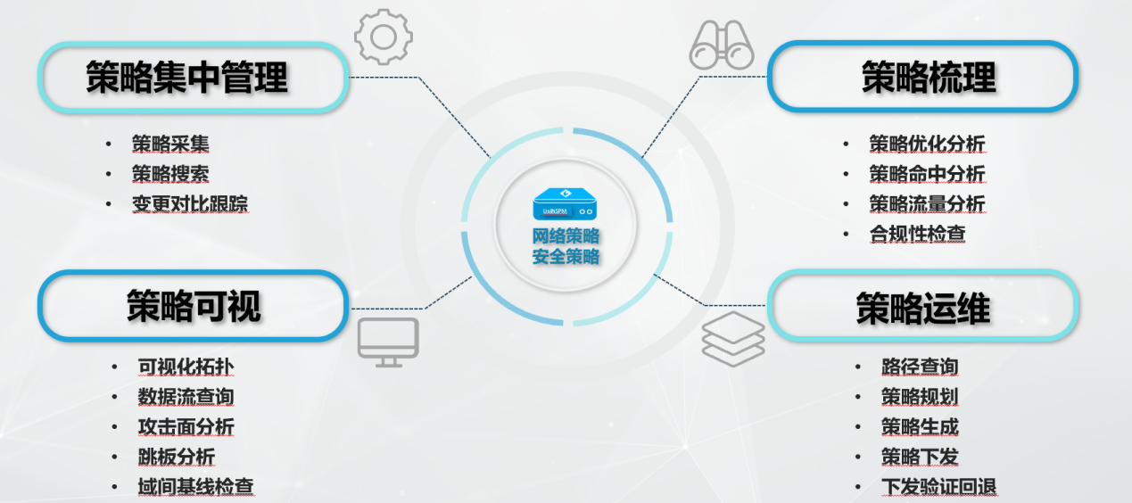 隨著信息化的加速,應(yīng)用場景不斷增加,網(wǎng)絡(luò)環(huán)境更加復(fù)雜,用戶面臨的網(wǎng)絡(luò)安全威脅也越來越大。防火墻以及路由交換設(shè)備日益增多,形成跨多個區(qū)域、多個機房、多層級的復(fù)雜局面,安全策略控制的粒度日趨細化嚴格,導(dǎo)致運維效率低、出錯概率大。 目前,許多用戶對安全策略的管理缺乏有效手段,使得安全策略處于“不可見”的狀態(tài),無法檢查全策略配置的正確性。在安全策略配置變更、新增時,管理員操作依據(jù)較為模糊,缺少相關(guān)的數(shù)據(jù)分析,容易造成安全策略配置上的缺陷或者錯誤,給系統(tǒng)安全與穩(wěn)定性帶來隱憂。