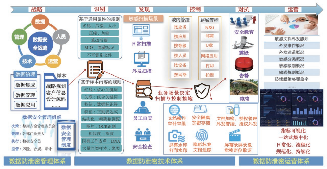 終端數(shù)據(jù)防泄密安全基線管理:基于準(zhǔn)入技術(shù)實(shí)現(xiàn)網(wǎng)絡(luò)邊界安全及強(qiáng)制終端安裝客戶端軟件,通過客戶端軟件按需下發(fā)策略實(shí)現(xiàn)終端基線管理、標(biāo)準(zhǔn)化管理和數(shù)據(jù)防泄密,其中防泄密基于數(shù)據(jù)分類分級(jí)規(guī)則實(shí)現(xiàn)終端敏感數(shù)據(jù)發(fā)現(xiàn)、數(shù)據(jù)通道收斂、基于數(shù)據(jù)通道審計(jì)和外發(fā)監(jiān)控、水印及數(shù)據(jù)泄密安全風(fēng)險(xiǎn)可視化管理。