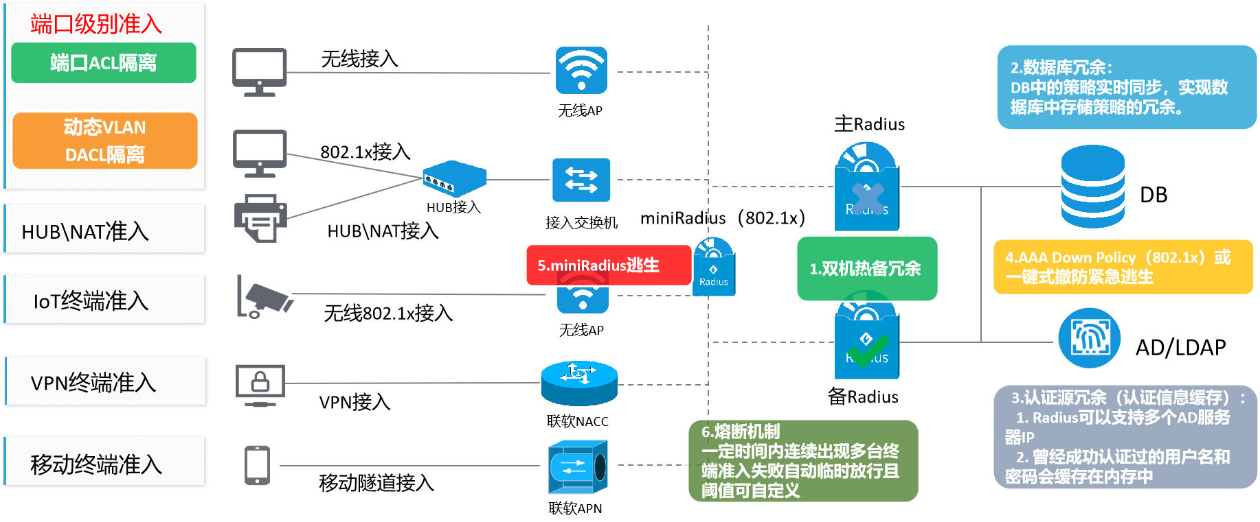 支持802.1x、Cisco EoU、WebAuth、Portal、端口鏡像等多種準(zhǔn)入技術(shù),能夠?qū)崿F(xiàn)醫(yī)院復(fù)雜網(wǎng)絡(luò)環(huán)境下的接入控制。