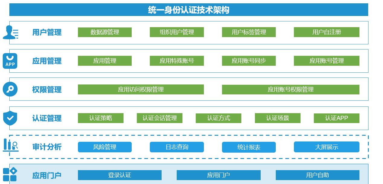 用戶管理:包含數(shù)據(jù)源管理、組織用戶管理、用戶標(biāo)簽管理、用戶自注冊(cè);數(shù)據(jù)源可以支持LDAP同步、API同步、數(shù)據(jù)庫(kù)同步、FTP同步、Excel導(dǎo)入等多種方式;組織用戶管理,包含用戶試圖、用戶管理等;