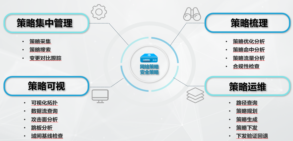安全策略管理系統(tǒng)通過對全網(wǎng)防火墻、路由交換、負(fù)載設(shè)備的數(shù)據(jù)進(jìn)行采集和解析,建立統(tǒng)一的設(shè)備模型和拓?fù)淠P?。實現(xiàn)對安全策略的智能精確梳理,發(fā)現(xiàn)策略中的隱藏策略、冗余策略、過期策略、空策略和可合并策略等。通過可視化視圖展示路徑查詢結(jié)果、數(shù)據(jù)流關(guān)系、攻擊面分析、跳板分析和安全域基線檢查矩陣。系統(tǒng)內(nèi)置策略自動化運維流程,可以針對不同的策略運維場景提供智能化、自動化的解決方案,輔助運維人員實現(xiàn)策略開通、策略批量下發(fā)、一鍵封堵等多項功能。