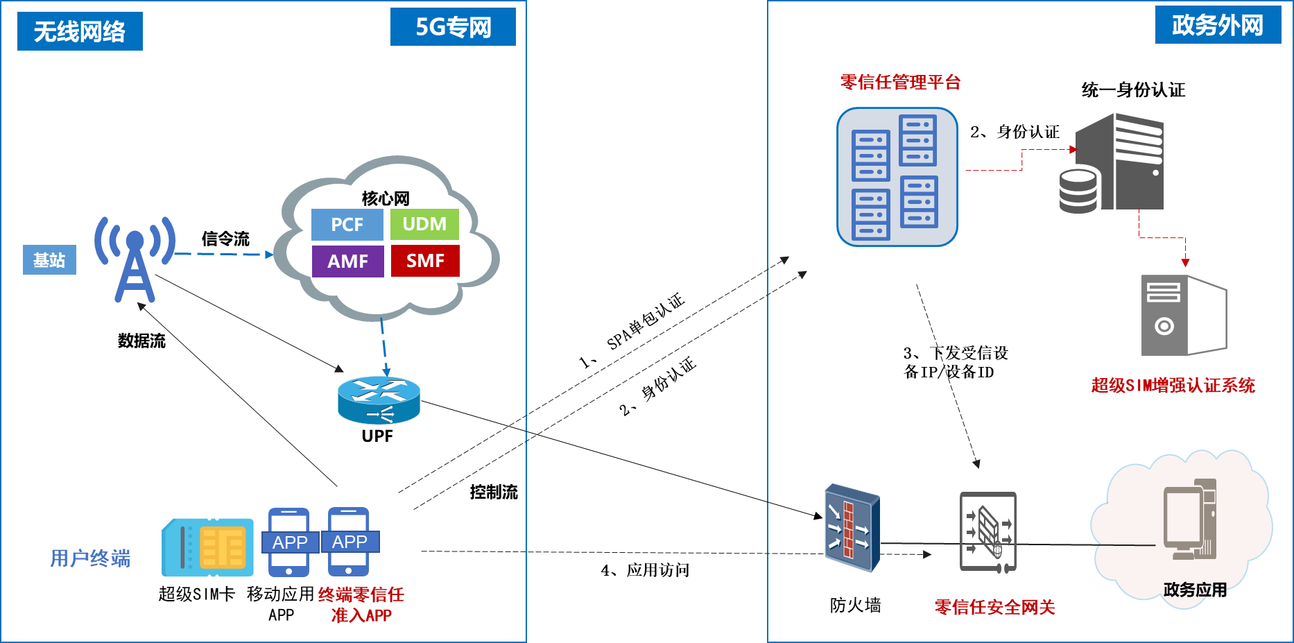 國家電子政務(wù)外網(wǎng)作為我國電子政務(wù)重要公共基礎(chǔ)設(shè)施,是服務(wù)于各級黨委、人大、政府、政協(xié)、法院和檢察院等政務(wù)部門,滿足其經(jīng)濟(jì)調(diào)節(jié)、市場監(jiān)管、社會管理和公共服務(wù)等方面需要的政務(wù)公用網(wǎng)絡(luò)。5G技術(shù)具有高帶寬、低時延、海量終端通信三大基本特征,正賦能促進(jìn)政務(wù)信息化、數(shù)字化、智能化轉(zhuǎn)型。5G基礎(chǔ)設(shè)施布局、以5G專網(wǎng)為代表的創(chuàng)新技術(shù)發(fā)展基本成熟,足以支撐政務(wù)行業(yè)賦能,各地政府單位已開展5G智慧應(yīng)用建設(shè),如移動辦公、移動執(zhí)法、疫情防控、安防監(jiān)控等場景,5G新技術(shù)的政務(wù)應(yīng)用處于快速發(fā)展階段。 在政策推動方面,《“十四五”國家信息化規(guī)劃》代表著由中央從頂層規(guī)劃5G發(fā)展數(shù)字藍(lán)圖。國家大力支持出臺包括《5G應(yīng)用“揚(yáng)帆”行動計劃(2021-2023年)》在內(nèi)的政策文件,其中各省市重點扶持5G政策文件574個,全國各地掀起了5G應(yīng)用“揚(yáng)帆”發(fā)展的熱潮,各地政府紛紛結(jié)合當(dāng)?shù)貙嶋H需求和產(chǎn)業(yè)特色推出5G發(fā)展行動計劃。同時,也對5G專網(wǎng)提出了很高的安全要求,例如十四五“國家信息化規(guī)劃”中提出要強(qiáng)化5G網(wǎng)絡(luò)安全保障體系;《廣東省電子政務(wù)外網(wǎng)5G無線接入服務(wù)建設(shè)規(guī)范》中要求:5G無線網(wǎng)絡(luò)應(yīng)提供網(wǎng)絡(luò)側(cè)的二次認(rèn)證能力,并應(yīng)對接政務(wù)外網(wǎng)認(rèn)證服務(wù)器,當(dāng)5G無線網(wǎng)絡(luò)核心網(wǎng)收到移動終端的業(yè)務(wù)請求時,觸發(fā)用戶二次鑒權(quán)。國家信息中心也于2022年7月1日頒布《政務(wù)外網(wǎng)終端一機(jī)兩用安全管控技術(shù)指南》,5G專網(wǎng)作為政務(wù)外網(wǎng)組成的一部分也應(yīng)該參考該標(biāo)準(zhǔn)要求,利用零信任技術(shù),確保只有合法合規(guī)的終端才能接入到5G專網(wǎng)訪問相應(yīng)權(quán)限范圍內(nèi)的應(yīng)用。 5G專網(wǎng)帶來高速、便捷的政務(wù)業(yè)務(wù)訪問,同時也伴隨著安全風(fēng)險,這些風(fēng)險來源于:(1)5G專網(wǎng)二次認(rèn)證安全風(fēng)險:終端接入到5G網(wǎng)絡(luò)時通過5G核心網(wǎng)UDM進(jìn)行的鑒權(quán)認(rèn)證成功后,獲得5G專網(wǎng)網(wǎng)絡(luò)資源,在訪問電子政務(wù)網(wǎng)時不需要進(jìn)行認(rèn)證,存在安全風(fēng)險。(2)5G專網(wǎng)熱點共享安全風(fēng)險:終端接入到5G專網(wǎng)存在熱點共享非授權(quán)訪問風(fēng)險,即5G專網(wǎng)手機(jī)開啟WIFI熱點,非授權(quán)終端能夠通過該熱點訪問5G專網(wǎng)。